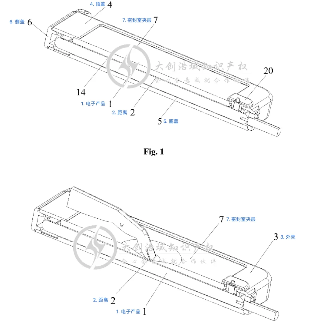 该#防水手机壳 的美国发明专利内容大致如下:1.密封装置:密封室夹层:这是一个具有回弹性的透明层,位于电子产品的触摸屏前面。它能有效保护触摸屏免受水和灰尘侵入。密封外壳:它与密封室夹层密封连接,完全覆盖手机的其他部分。手机壳内有一个密封装置,用于容纳手机等电子产品。密封装置由两部分组成:2.触摸屏操作:尽管触摸屏被密封室夹层覆盖,但用户仍然可以通过对密封室夹层施加外力(例如按压)来正常操作触摸屏。3.内部绝缘流体:密封室夹层内部充满了一种绝缘流体,进一步增强了防水和防尘效果。4.密封室夹层的结构:单层结构:如果密封室夹层只有一层,那么它的顶部和底部各有一层绝缘密封膜。多层结构:如果有多个密封室夹层,除了顶部和底部的膜之外,每层夹层之间还会有至少一层中间的绝缘密封膜。这样可以增加额外的保护层。5.膜的厚度控制:每个密封室夹层的顶部和底部膜的总厚度,以及多个夹层中所有膜的总厚度,应该小于或等于触摸屏感应有效距离的最大值。这样可以确保触摸屏依然能够正常感应操作。同时,密封室夹层的厚度要大于或等于触摸屏整体感应的有效距离,以确保防护性能。6.空气间隙与充放电装置:在密封室夹层靠近触摸屏的表面与触摸屏之间,有一个均匀的空气间隙。这一间隙与外部的充放电装置相连通,确保手机能够正常充电或进行其他操作。
