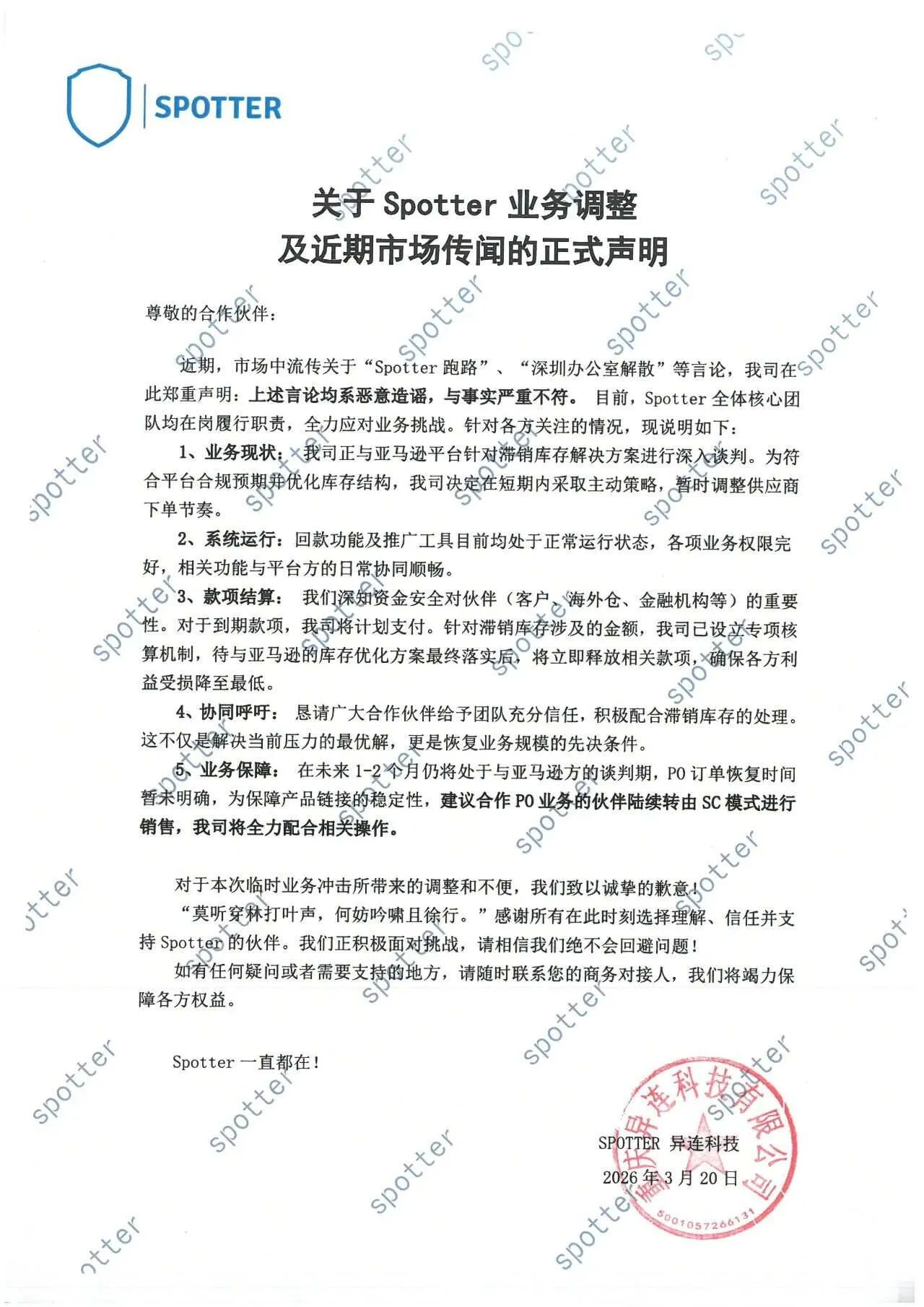 Spotter正与亚马逊针对滞销库存解决方案进行深入谈判,为符合平台合规预期并优化库存结构,短期内将采取主动策略,暂时调整供应链下单节奏;