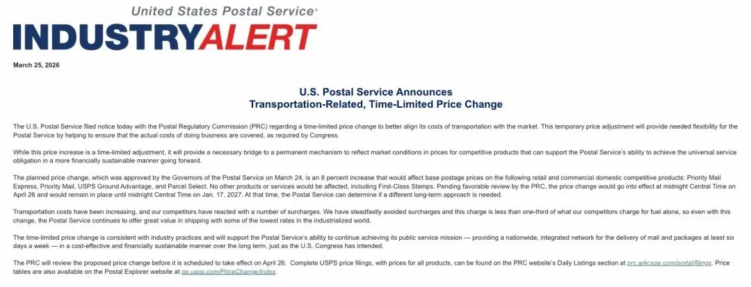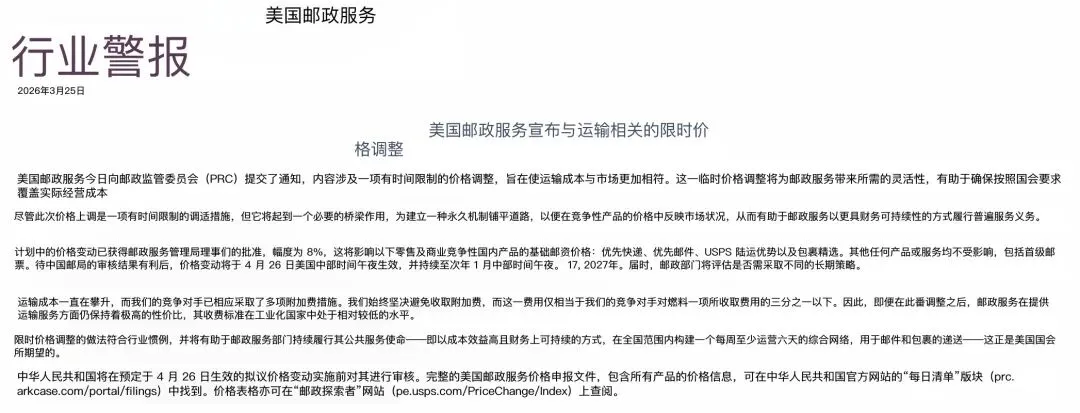 2026年3月25日,美国邮政(USPS)干了一件自己历史上从没干过的事:向邮政监管委员会(PRC)提交了一份限时价格调整方案,打算从4月26日开始,给部分国内竞争性业务涨8%的价,而且这波涨价不是永久的,一直持续到2027年1月17日,妥妥的“临时加价”操作。