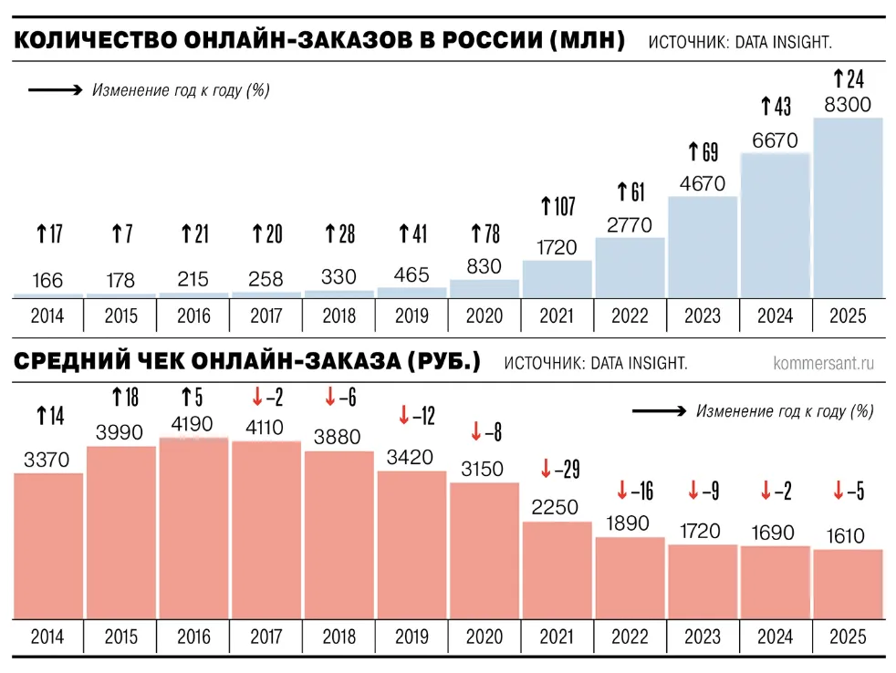 分析认为,俄罗斯电商市场增长放缓不仅与市场逐步趋于饱和有关,也与商品整体价格上涨后消费者行为变化有关。Data Insight预计,订单数量增长将在2026—2027年继续放缓,其中2026年预计增长20%。