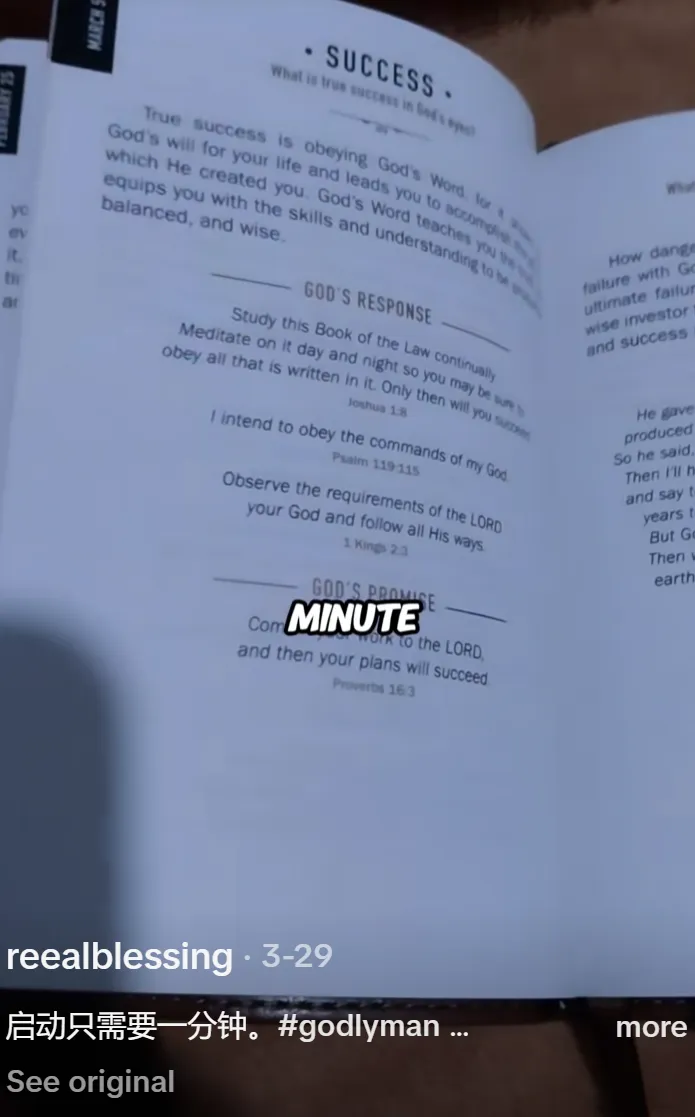 @reealblessing作为垂直赛道的博主,一方面对书中内容娓娓道来,引导网友如何将“1分钟对话上帝”融入日常;另一方面则反复强调这本圣经语录专为男士打造,她谈到,对很多男性而言,承认自己需要“精神补剂”和情绪出口往往被视为软弱,但迈出这一步正是成长的关键一环。这种直白的表达,精准收拢了那些渴望改变却羞于启齿的男性受众,引发强烈共鸣,甚至在评论区催生出彼此鼓励、分享挣扎的群体讨论。