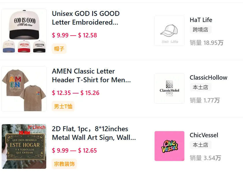 此前,有TikTok卖家借耶稣二创视频内容,开辟了邪修涨粉的路径,虽因缺乏真实信仰支撑而逐渐沉寂,但足以证明西方用户对这类内容的高度买账。这也提醒卖家,应深入了解基督教文化背景和用户心理诉求,在内容创作中体现出对信仰的尊重,才能建立长期信任和复购。数据显示,亚马逊上带有“Christian gifts”关键词的产品常年保持20%以上的年增长率,在TikTok美区,WWJD”(What Would Jesus Do)手链在TikTok美区30天爆卖4.5万件、木制十字架饰品近28天卖出约8000单、“Trust In God”车贴单日最高销量近6000件……随着卖家持续推陈出新,市场消费力仍在释放,各大平台“信仰经济”的市场天花板仍在持续刷新。目前在TikTok美区,热销的信仰类产品主要包括书籍、手账,以及帽子、服饰、装饰品等,手串、项链等需求属于靠后位置,说明在精神抚慰之外,叠加实用功能的信仰类产品愈发拥有一席之地,卖家可着重关注。