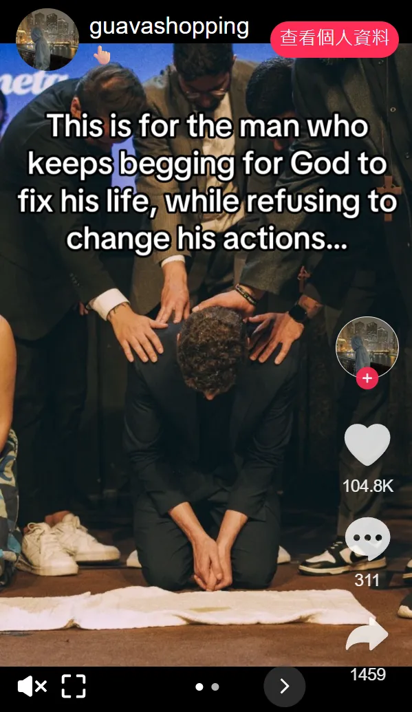 图源:TikTok达人@guavashopping的带货方式则更“粗暴”,仅用了两张meme图以及一句发人深省的文案:这就是光说不练假把的后果(嘴上说信仰但是没有实际行动),由此激发屏幕前网友的行动力,即找到一件触手可及的精神读物,每天感悟、实践其中的哲理智慧,即便只是在短暂的1分钟时间里。这份短平快的视觉暴击,最终带来了260万+曝光。