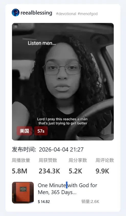纸媒的落寞,始于互联网的兴起,衰于短视频时代间的碎片化信息化获取。但是有这么一类书籍,它始终在畅销书籍榜单上拥有一席之地,那就是围绕西方宗教文学「圣经」,以及其相关的衍生文学。在TikTok美区,一款上架约半年时间的圣经周边,正是踩中这一风口,实现了爆单。01信仰消费,再度爆单TT123观察到,在TikTok美区视频带货销量榜上,一本名为「One Minute With God for Men」(与上帝同行一分钟,男士专享版)的书籍产品销量表现亮眼。近一周内,产品在一则播放量高达580万次带货视频的推动下,跻身视频带货周销榜前列。