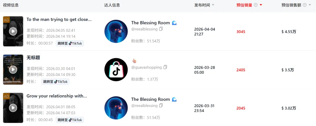 近30天,为产品出单贡献最多的两位达人分别是号称“祈祷室”的腰部达人@reealblessing和尾部达人@guavashopping,预估销量分别为5000+、2400+。